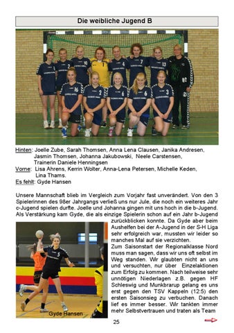 Hinten: Joelle Zube, Sarah Thomsen, Anna Lena Clausen, Janika Andresen, Jasmin Thomsen, Johanna Jakubowski, Neele Carstensen, Trainerin Daniele Henningsen Vorne: Lisa Ahrens, Kerrin Wolter, Anna-Lena Petersen, Michelle Keden, Lina Thams. Es fehlt: Gyde Hansen Unsere Mannschaft blieb im Vergleich zum Vorjahr fast unverändert. Von den 3 Spielerinnen des 98er Jahrgangs verließ uns nur Jule, die noch ein weiteres Jahr c-Jugend spielen durfte. Joelle und Johanna gingen mit uns hoch in die b-Jugend. Als Verstärkung kam Gyde, die als einzige Spielerin schon auf ein Jahr b-Jugend zurückblicken konnte. Da Gyde aber beim Aushelfen bei der A-Jugend in der S-H Liga sehr erfolgreich war, mussten wir leider so manches Mal auf sie verzichten. Zum Saisonstart der Regionalklasse Nord muss man sagen, dass wir uns oft selbst im Weg standen. Wir glaubten nicht an uns und versuchten, nur über Einzelaktionen zum Erfolg zu kommen. Nach teilweise sehr unnötigen Niederlagen z.B. gegen HF Schleswig und Munkbrarup gelang es uns erst gegen den TSV Kappeln (12:5) den ersten Saisonsieg zu verbuchen. Danach lief es immer besser. Wir tankten immer mehr Selbstvertrauen und traten als Team Gyde Hansen 25