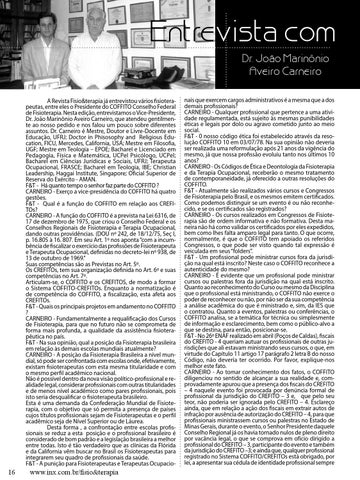 Entrevista com Dr. João Marinônio Aveiro Carneiro A Revista Fisio&terapia já entrevistou vários fisioterapeutas, entre eles o Presidente do COFFITO Conselho Federal de Fisioterapia. Nesta edição, entrevistamos o Vice-Presidente, Dr. João Marinônio Aveiro Carneiro, que atendeu gentilmente ao nosso pedido e nos falou um pouco sobre diferentes assuntos. Dr. Carneiro é Mestre, Doutor e Livre-Docente em Educação, UFRJ; Doctor in Phisosophy and Religious Education, FICU, Mercedes, California, USA; Mestre em Filosofia, UGF; Mestre em Teologia – EPOE; Bacharel e Licenciado em Pedagogia, Física e Matemática, UCPel Psicólogo, UCPel; Bacharel em Ciências Jurídicas e Sociais, UFRJ; Terapeuta Ocupacional, FRASCE; Bacharel em Teologia, IBE; Christian Leadership, Haggai Institute, Singapore; Oficial Superior de Reserva do Exército - AMAN. F&T - Há quanto tempo o senhor faz parte do COFFITO ? CARNEIRO - Exerço a vice-presidência do COFFITO há quatro gestões. F&T - Qual é a função do COFFITO em relação aos CREFITOs? CARNEIRO - A função do COFFITO é a prevista na Lei 6316, de 17 de dezembro de 1975, que criou o Conselho Federal e os Conselhos Regionais de Fisioterapia e Terapia Ocupacional, dando outras providências. (DOU nº 242, de 18/12/75, Seç I, p. 16.805 à 16. 807. Em seu Art. 1º nos aponta “com a incumbência de fiscalizar o exercício das profissões de Fisioterapeuta e Terapeuta Ocupacional, definidas no decreto-lei nº 938, de 13 de outubro de 1969.” Suas competências são as Previstas no Art. 5º. Os CREFITOs, tem sua organização definida no Art. 6º e suas competências no Art. 7º. Articulam-se, o COFFITO e os CREFITOS, de modo a formar o Sistema COFFITO-CREFITOs. Enquanto a normatização é de competência do COFFITO, a fiscalização, esta afeta aos CREFITOs. F&T - Quais os principais projetos em andamento no COFFITO ? CARNEIRO - Fundamentalmente a requalificação dos Cursos de Fisioterapia, para que no futuro não se comprometa de forma mais profunda, a qualidade da assistência fisioterapêutica no país. F&T - Na sua opinião, qual a posição da Fisioterapia brasileira em relação às demais escolas mundiais atualmente? CARNEIRO - A posiçào da Fisioterapia Brasileira a nível mundial, só pode ser confrontada com escolas onde, efetivamente, existam fisioterapeutas com esta mesma titularidade e com o mesmo perfil acadêmico nacional. Não é possível dentro da nova visão político-profissional e realidade legal, considerar profissionais com outras titularidades e de menos nível acadêmico como pares profissionais, pois isto seria desqualificar o fisioterapeuta brasileiro. Esta é uma demanda da Confederação Mundial de Fisioterapia, com o objetivo que só permita a presença de países cujos títulos profissionais sejam de Fisioterapeutas e o perfil acadêmico seja de Nível Superior ou de Láurea. Desta forma , a confrontação entre escolas profissionais se reduz a esta posição e o profissional brasileiro é considerado de bom padrão e a legislação brasileira a melhor entre todas. Isto é tão verdadeiro que as clínicas da Flórida e da California vêm buscar no Brasil os Fisioterapeutas para integrarem seu quadro de profissionais da saúde. F&T - A punição para Fisioterapeutas e Terapeutas Ocupacio-