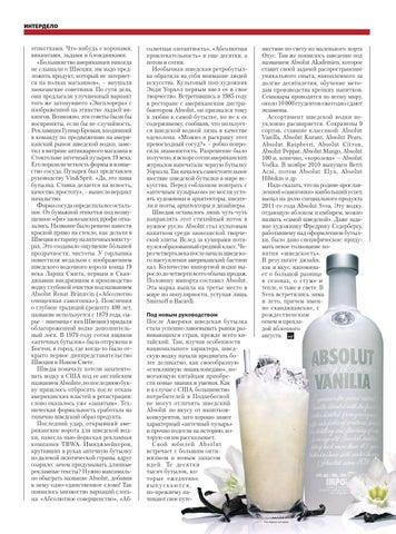 солютная элегантность», «Абсолютная привлекательность» и еще десятки, а потом и сотни. Необычная шведская ретробутылка обратила на себя внимание людей искусства. Культовый поп-художник Энди Уорхол первым ввел ее в свое творчество. Встретившись в 1985 году в ресторане с американским дистрибьютором Absolut, он признался тому в любви к самой бутылке, но не к ее содержимому, сообщив, что пользуется шведской водкой лишь в качестве одеколона. «Можно я раскрашу этот превосходный сосуд?» – робко попросила знаменитость. Разрешение было получено, и вскоре сотни американских журналов напечатали черную бутылку Уорхола. Так началось самостоятельное шествие шведской бутылки в мире искусства. Перед соблазном поиграть с «аптечным пузырьком» не могли устоять художники и архитекторы, писатели и поэты, архитекторы и дизайнеры. Шведам оставалось лишь чуть-чуть направлять этот стихийный поток в нужное русло. Absolut стал культовым напитком среди заокеанской творческой элиты. Вслед за кумирами потянулся образованный средний класс. Через четверть века после начала шведского наступления американский бастион пал. Количество импортной водки выросло до четверти всего объема продаж. Половину импорта составил Absolut. Эта марка вышла на третье место в мире по популярности, уступая лишь Smirnoff и Bacardi. Под новым руководством После Америки шведская бутылка стала успешно завоевывать рынки развивающихся стран, прежде всего китайский. Там, изучив особенности национального характера, шведскую водку начали продвигать более деликатно, как своеобразную «стеклянную энциклопедию», помогающую китайцам приобрести новые знания и умения. Как и в случае с США, большинство потребителей в Поднебесной не могут отличить шведский Absolut по вкусу от напитковконкурентов, зато хорошо знают характерный «аптечный пузырь» и прочно подсели на историю, которую он им рассказывает. Свой юбилей Absolut встречает с большим оптимизмом и новым запасом идей. Те десятки тысяч бутылок, которые ежедневно выпускаются, по-прежнему начинают свое путе-