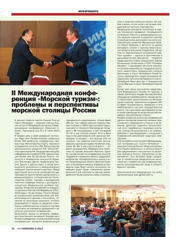 В рамках проекта партии Единая Россия «Санкт%Петербург – морская столица Рос% сии» в Санкт%Петербурге состоялась II Меж% дународная конференция «Морской ту% ризм». Проходила она 8 и 9 июля 2010 года. В первый день в зале заседаний гостини% цы «Парк Инн Прибалтийская» собралось более 350 делегатов конференции: пер% вые лица Министерства спорта, туризма и молодежной политики РФ, Министерства регионального развития РФ, Министер% ства транспорта РФ, Государственной думы и Федерального собрания РФ, администра% ций более чем 30 регионов России, по% сольств и генеральных консульств Герма% нии, Финляндии, Дании, Нидерландов, Лат% вии, Турции и других стран, а также руко% водители российских и международных компаний туристической индустрии. Перед аудиторией выступила руководитель де% партамента туристической деятельности и международного сотрудничества Мини% стерства спорта, туризма и молодежной политики Надежда Назина с докладом о концепции Федеральной целевой про% граммы «Развитие внутреннего и въездно% го туризма в Российской Федерации (2011% 2016 годы)». По ее словам, Россия облада% ет уникальными возможностями для раз% вития морского туризма, и эта отрасль, не% смотря на некоторые сложности, активно развивается. О мерах по решению струк% турных проблем речных и морских круизов и шла речь на пленарных заседаниях и па% нельных дискуссиях конференции. Безусловно, одним из вопросов, требую% щих пристального внимания государства и бизнес%сообщества, по мнению участников конференции, является модернизация