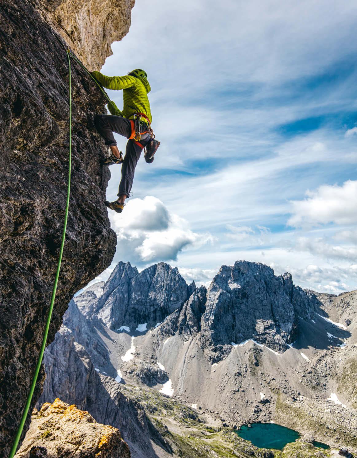 Mit Blick auf das grüne Juwel Wer also von der Karlsbader Hütte (liegt unten am dunkelgrünen Laserzsee) nach oben blickt, sieht Peter Mühlburger, der gerade den Roten Turm (2.702 m) erklimmt. Im Hintergrund: Seekofel (rechts) und Wilder Sender.