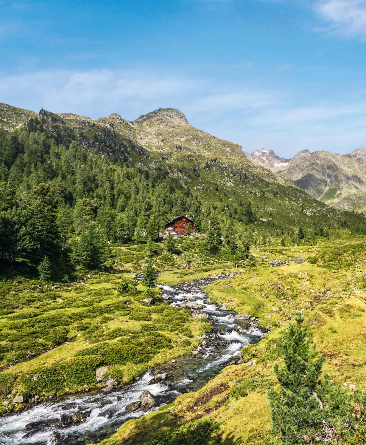1 Mit seinen 16 Kilometern ist das Debant tal das längste in sich geschlossene Almtal Österreichs. An seinem Ende wartet der . 2 Die Schobergruppe ist nicht nur stein-, sondern auch wasserreich – im Bild der Wangenitzsee. 3 Eine, die hier vermutlich schon jeden Bachlauf erkundet hat, ist Berni Baumgartner, Wirtin der Lienzer Hütte. 4 u. 5 Auf der Hofalm wird man nur in größeren Gruppen bei Voranmeldung mit köstlichem Almkäse und anderen Leckereien verwöhnt. Ansonsten ist die Hütte nicht bewirtschaftet.