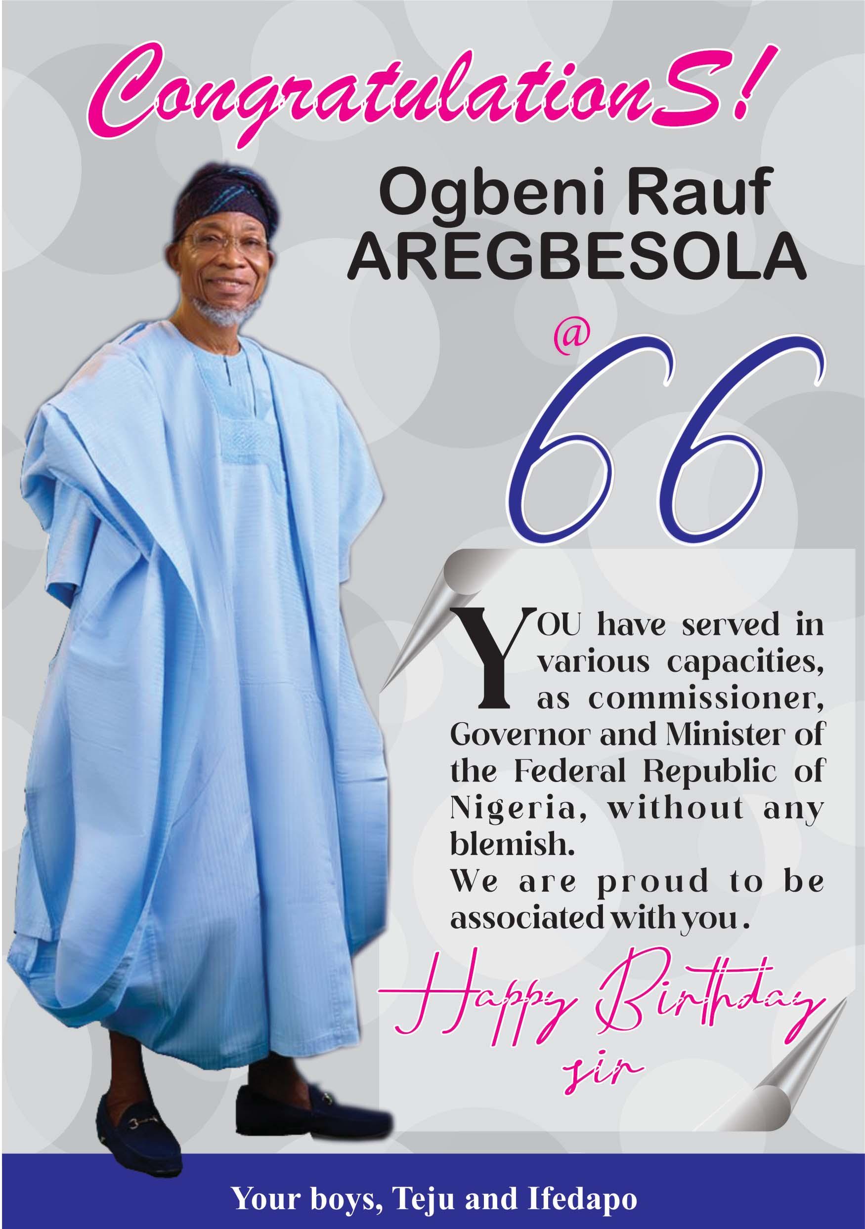WELL WISHERS have been pouring encomiums on the Minister of Interior, Ogbeni Rauf Aregbesola, who celebrates his 66th birthday today, Thursday, May 25.