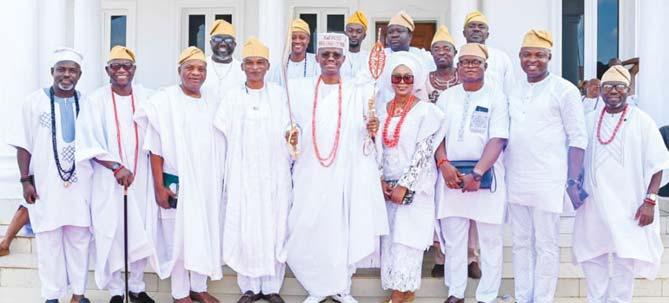 •Nigeria Institution of Estate Surveyors and Valuers NIESV President and Chairman of Council, ESV Victor Alonge PNIVS, FROCS, FCIoD, flanked by his wife, Deaconess Alonge, the institution excos and members at his installation as the Awokose Omoluabi Oodua by Oonirisa, HIM Oba Adeyeye Enitan Ogunwusi CFR Ojaja II, during Ooni’s 51st Birthday Celebration at the palace in Ile-Ife last Friday