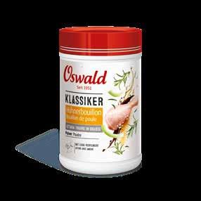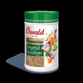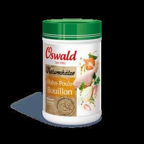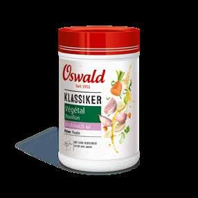 besonders gut auf. So erhält die Suppe einen vollmundigen Charakter und muss bzw. kann am Schluss nur noch mit Gewürzen für die richtige «Kopfnote» abgeschmeckt werden. Grundsätzlich empfehlen wir dafür den Griff zur Gemüsebouillon. Mit unserer Gemüsebouillon Pur Bio Naturschätze lässt sich beispielsweise eine vortreffliche Pastinakensuppe mit Petersilienschaum zaubern, indem Sie das Gemüse damit ablöschen (das Rezept finden Sie auf oswald.ch). Für währschafte Suppen mit Fleischeinlage wirkt allerdings auch eine kräftige Fleischbouillon wahre Wunder.