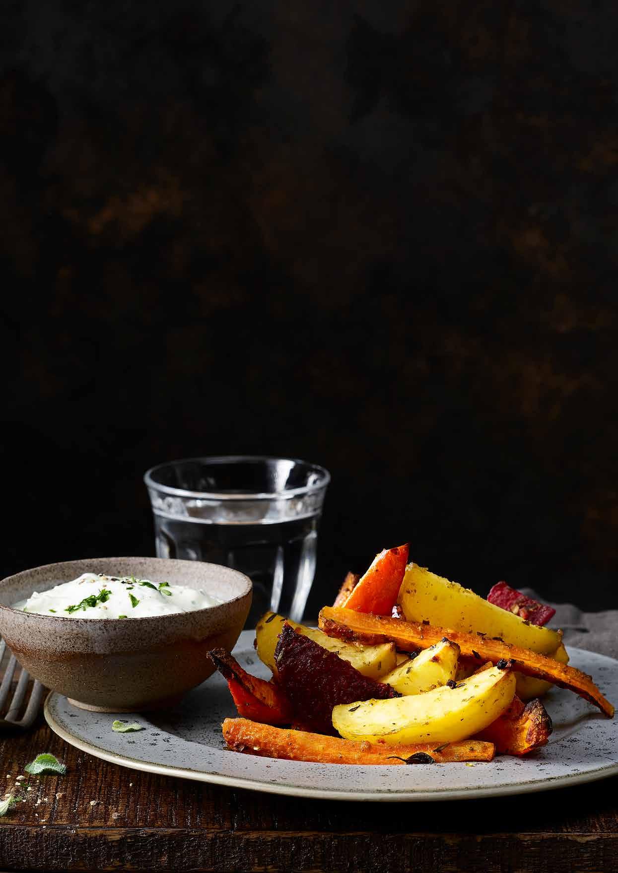 OFENGEMÜSE MIT TZATZIKI DIP Vor- und Zubereitungszeit: 40 Minuten Zutaten für 4 Personen: 800 g saisonales Gemüse (z.B. Rüebli, Kürbis, Sellerie, Randen) 600 g Kartoffeln 4 EL Oswald Olivenöl Extra Vergine 2 EL Oswald Végétal Bouillon Naturschätze Dip 180 g Joghurt nature 3 EL Oswald Tzatziki Dip (1 OM = 1 Oswald-Messlöffel = ca. 1 Esslöffel) Zubereitung: 1. Ofen