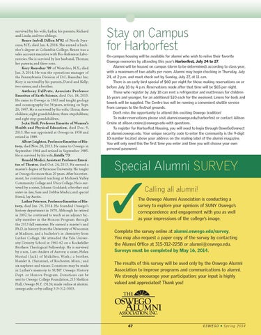 Special Alumni SURVEY Calling all alumni! The Oswego Alumni Association is conducting a survey to explore your opinions of SUNY Oswego’s correspondence and engagement with you as well as your impressions of the college’s image. Complete the survey online at alumni.oswego.edu/survey. You may also request a paper copy of the survey by contacting the Alumni Office at 315-312-2258 or alumni@oswego.edu. Surveys must be completed by May 16, 2014. The results of this survey will be used only by the Oswego Alumni Association to improve programs and communications to alumni. We strongly encourage your participation; your input is highly valued and appreciated! Thank you!
