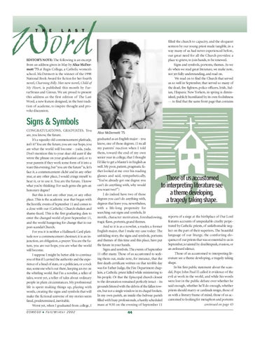 Signs & Symbols CONGRATULATIONS, GRADUATES. You are, you know, the future. It’s a squeaky old commencement platitude, isn’t it? You are the future, you are our hope, you are what the world will become – yada, yada. Don’t mention this to your dear old aunt if she wrote the phrase on your graduation card, or to your parents if they work some form of it into a toast this evening, but “you are the future” is, let’s face it, a commencement cliché and in any other year, at any other place, I would cringe myself to hear it, or to use it. You are the future. I know what you’re thinking: For such gems she gets an honorary degree? But this is not any other year, or any other place. This is the academic year that began with the horrific events of September 11 and comes to a close with our (Catholic) Church shaken and shame-faced. This is the first graduating class to enter the changed world of post-September 11, and the world hungering for change that is our post-scandal Church. For you it is neither a Hallmark Card platitude nor a commencement chestnut; it is an injunction, an obligation, a prayer: You are the future, you are our hope, you are what the world will become. I suppose I might be better able to convince you of this if I carried the authority and the experience of a head of state, or a politician, or a rock star, someone who’s out there, keeping an eye on the whirling world. But I’m a novelist, a teller of tales, worst yet, a teller of tales about ordinary people in plain circumstances. My professional life is spent making things up, playing with words, creating the signs and symbols that will make the fictional universe of my stories seem fated, predetermined, inevitable. Worst yet, when I graduated from college, I OSWEGO