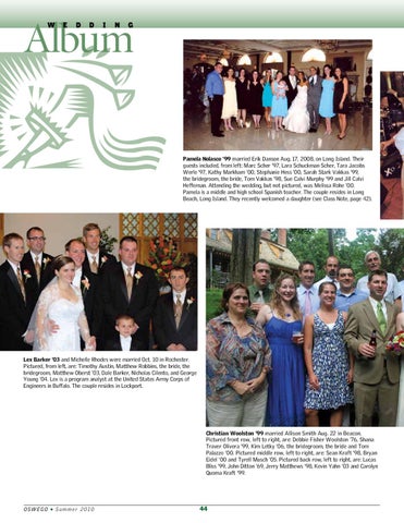 Pamela Nolasco ’99 married Erik Danson Aug. 17, 2008, on Long Island. Their guests included, from left: Marc Scher ’97, Lara Schuckman Scher, Tara Jacobs Werle ’97, Kathy Markham ’00, Stephanie Hess ’00, Sarah Stark Vakkas ’99, the bridegroom, the bride, Tom Vakkas ’98, Sue Calvi Murphy ’99 and Jill Calvi Heffernan. Attending the wedding, but not pictured, was Melissa Rohe ’00. Pamela is a middle and high school Spanish teacher. The couple resides in Long Beach, Long Island. They recently welcomed a daughter (see Class Note, page 42).