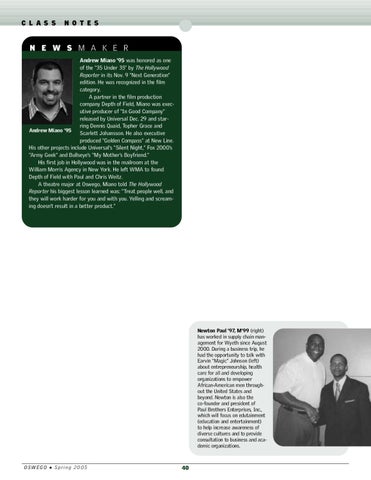 N E W S M A K E R Andrew Miano ’95 was honored as one of the “35 Under 35” by The Hollywood Reporter in its Nov. 9 “Next Generation” edition. He was recognized in the film category. A partner in the film production company Depth of Field, Miano was executive producer of “In Good Company” released by Universal Dec. 29 and starring Dennis Quaid, Topher Grace and Andrew Miano ’95 Scarlett Johansson. He also executive produced “Golden Compass” at New Line. His other projects include Universal’s “Silent Night,” Fox 2000’s “Army Geek” and Bullseye’s “My Mother’s Boyfriend.” His first job in Hollywood was in the mailroom at the William Morris Agency in New York. He left WMA to found Depth of Field with Paul and Chris Weitz. A theatre major at Oswego, Miano told The Hollywood Reporter his biggest lesson learned was: “Treat people well, and they will work harder for you and with you. Yelling and screaming doesn’t result in a better product.”