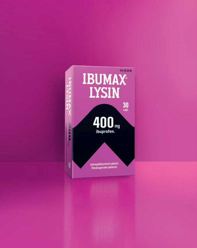 Ibumax Lysin 400 mg kalvopäällysteiset tabletit. Vaikuttava-aine: ibuprofeeni (ibuprofeenilysiininä). Lyhytaikaisesti kuume- ja kiputiloihin, kuten päänsärkyyn, kuukautiskipuihin ja hammassärkyyn. Aikuisille ja yli 20 kg painaville, vähintään 6-vuotiaille lapsille. Varmista tuotteen soveltuvuus apteekista, etenkin jos saat astma- tai allergiaoireita muista särkylääkkeistä, sinulla on vatsahaava, ruuansulatuskanavan verenvuodolle altistava tila, vaikea sydämen, maksan tai munuaisten vajaatoiminta, verenvuototaipumus tai verisolujen muodostumiseen liittyvä häiriö, olet vaikeasti kuivunut tai raskaana tai käytät muita lääkkeitä. Lääkettä ei tule käyttää raskauden viimeisen kolmanneksen aikana. Tutustu huolellisesti pakkausselosteeseen. Itsehoitolääke. Pakkauskoko 30 tabl. (01/2025)