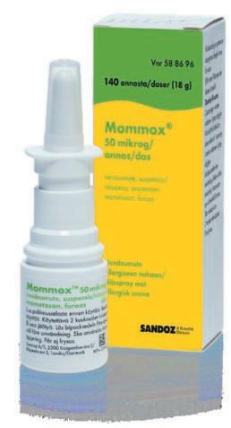 Desloratadine Sandoz® 5 mg kalvopäällysteinen tabletti. Vaikuttava aine: desloratadiini. Käyttöaihe: Allergisen nuhan ja nokkosihottuman oireiden lievittämiseen aikuisille ja vähintään 12-vuotiaille. Annostus: yksi tabletti kerran päivässä. Älä käytä tätä lääkettä, jos olet allerginen vaikuttavalle aineelle tai apuaineille. Varoitukset ja varotoimet: Varmista tuotteen sopivuus itsellesi apteekista. Mikäli sinulla on munuaisten vajaatoiminta, sinulla tai suvussasi on aiemmin ollut kouristuskohtauksia, olet raskaana tai imetät tai suunnittelet lapsen hankkimista, kysy valmisteen käytöstä lääkäriltäsi. Ei suositella raskauden ja imetyksen aikana. Kerro lääkärille tai apteekkihenkilökunnalle, jos parhaillaan käytät tai olet äskettäin käyttänyt tai saatat käyttää muita lääkkeitä. Jos oireet eivät helpotu viiden päivän kuluessa lääkityksen aloittamisesta, ota yhteyttä lääkäriin. Yleiset haittavaikutukset: Päänsärky, suun kuivuminen ja väsymys. Muut ks. pakkausseloste. Itsehoitolääke. Tutustu huolellisesti pakkausselosteeseen. Pakkaukset ja hinnat: 15.11.2024: Desloratadine Sandoz 5 mg tabletti, kalvopäällysteinen 10 fol 7,90 €, 30 fol 14,91 €, 100 fol 21,44 €. Ajantasaiset hintatiedot: Kela.fi/laakehaku. Markkinoija: Sandoz A/S, www.sandoz.fi, mi.finland@sandoz.com. NR2312215930, 12/2023. Perustuu 03.06.2022 päivättyyn valmisteyhteenvetoon. Mommox® 50 mikrog/annos, nenäsumute. Vaikuttava aine: mometasonifuroaatti. Käyttöaihe: Aikuisille (yli 18-vuotiaat) kausiluonteisen allergisen nuhan hoitoon. Annostus: kaksi suihketta molempiin sieraimiin kerran päivässä. Älä käytä, jos olet allerginen vaikuttavalle aineelle tai apuaineille tai jos nenässäsi on infektio, nenä on viime aikoina leikattu tai vahingoittunut. Älä käytä raskauden tai imetyksen aikana, ellei lääkäri ole niin määrännyt. Varoitukset ja varotoimet: Kerro lääkärille tai apteekkihenkilökunnalle, jos parhaillaan käytät tai olet äskettäin käyttänyt tai saatat käyttää muita lääkkeitä. Jotkin lääkkeet (kuten HIV-lääkkeet) saattavat voimistaa Mommox-valmisteen tehoa. Jos käytät muita kortikosteroidilääkkeitä, sinulla on jokin muu infektio, kystinen fibroosi tai on tai on aiemmin ollut tuberkuloosi, keskustele aina lääkärin tai apteekkihenkilökunnan kanssa ennen käyttöä. Jos oireet eivät lievity 7 päivän kuluessa, käänny lääkärin puoleen. Yleiset haittavaikutukset: Päänsärky, aivastelu, nenäverenvuoto, nenä- ja kurkkukipu, nenän haavaumat ja hengitystieinfektio. Muut ks. pakkausseloste. Itsehoitolääke. Tutustu huolellisesti pakkausselosteeseen. Pakkaus ja hinta: 15.11.2024: Mommox nenäsumute, suspensio 50 mikrog/annos 140 annosta pullo 17,28 €. Ajantasaiset hintatiedot: Kela.fi/laakehaku. Markkinoija: Sandoz A/S, www.sandoz.fi, mi.finland@sandoz.com. NR2401047174, 1/2024. Perustuu 11.02.2021 päivättyyn valmisteyhteenvetoon.