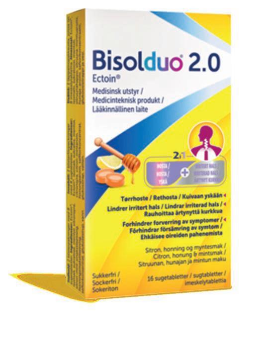 Bisolduo® 2.0 (Ectoin®), imeskelytabletti. Lääkinnällinen laite. Vähentää ärsytystä ja tarvetta yskiä. Ehkäisee oireiden pahentumista. Ei alle 6-vuotiaille lapsille. Kysy neuvoa terveydenhuollon ammattilaiselta tai apteekkihenkilökunnalta ennen tämän lääkinnällisen laitteen käyttöä jos olet raskaana tai imetät tai et ole varma oletko raskaana. Lue käyttöohjeet huolellisesti. Valmistaja: bitop AG. Markkinoija: STADA Nordic