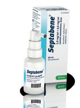 Septabene (1,5 mg/ml + 5 mg⁄ml bentsydamiini setyylipyridiini ) sumute suuonteloon suun ja nielun kivun ja tulehduksen oireiden lyhytaikaiseen paikallishoitoon yli 12-vuotiaille. Annostus: 1–2 suihkausta kahden tunnin välein 3–5 kertaa vuorokaudessa. Ei alle 6 vuotiaille. Ei raskaana oleville tai imettäville. Tutustu pakkausselosteeseen. Itsehoitolääke
