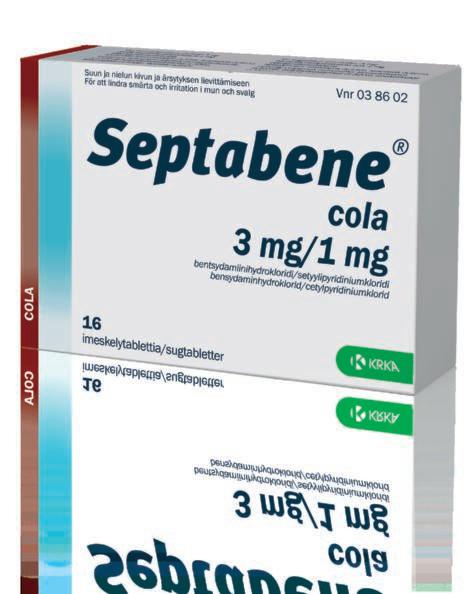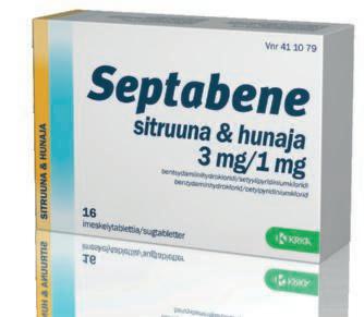 Septabene cola, Septabene eukalyptus, Septabene sitruuna & seljankukka ja Septabene sitruuna & hunaja (3 mg/1 mg bentsydamiini/setyylipyridiini) imeskelytabletit suun ja nielun kivun ja tulehduksen oireiden lyhytaikaiseen paikallishoitoon. Annostus: 3–4 imeskelytablettia vuorokaudessa. 6–12-vuotiaille vain lääkärin määräyksestä. Ei alle 6-vuotiaille. Ei raskaana oleville tai imettäville. Tutustu pakkausselosteeseen. Itsehoitolääke.