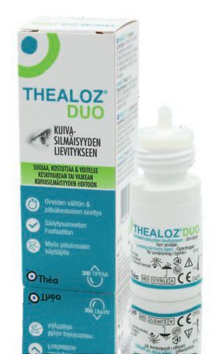 THEALOZ® DUO 5 ml ja 10 ml: CE-merkitty lääkinnällinen laite kohtalaisen tai vaikean kuivasilmäisyyden hoitoon. Trehaloosi 3 %, natriumhyaluronaatti 0,15 % natriumkloridi, trometamoli, kloorivetyhappo, injektionesteisiin käytetty vesi. Fosfaatiton. Hypotoninen. Säilytysaineeton. Yksi tippa kumpaankin silmään tasaisesti pitkin päivää aina tarvittaessa. Tutustu pakkausselosteeseen ennen käyttöä. Oireiden pahentuessa käänny lääkärin puoleen. Säilyy 6 kk avaamisesta. Saatavana apteekeista.