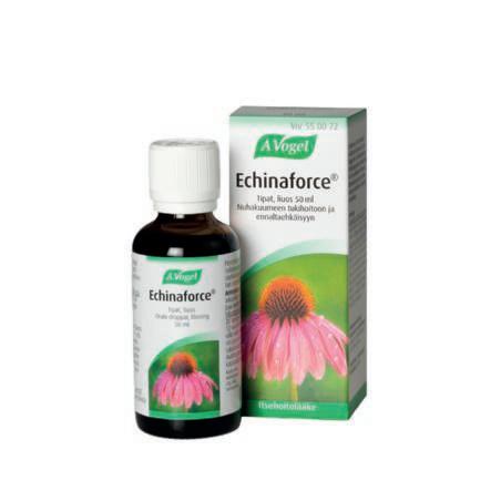 Echinaforce on perinteinen kasvirohdosvalmiste nuhakuumeen tukihoitoon ja ennaltaehkäisyyn. Valmisteen käyttö perustuu yksinomaan sen traditio naaliseen eli pitkään jatkuneeseen käyttöön. Echinaforcen vaikuttavat aineet ovat kaunopunahatun tuoreesta versosta sekä juuresta valmistettu etanoliuute. Jos olet allerginen punahatuille ja/tai mykerökukkaisille tai jos sinulla on jokin etenevä systeeminen sairaus, autoimmuunisairaus, immuunipuutos tai verisairaus älä käytä tuotetta. Saa käyttää enintään 10 vrk:n ajan akuuttien oireiden hoitoon ja korkeintaan 2 kk ajan yhtäjaksoisesti vilustumisoireiden ennaltaehkäisyyn. Keskustele lääkärin kanssa ennen valmisteen käyttöä, jos sinulla on jokin maksa- tai munuaissairaus, jos olet atoopikko tai olet herkkä saamaan allergisia reaktioita. Ei suositella raskauden tai imetyksen aikana. Tutustu pakkausselosteeseen ennen valmisteen käyttöä. Markkinoija A.Vogel.
