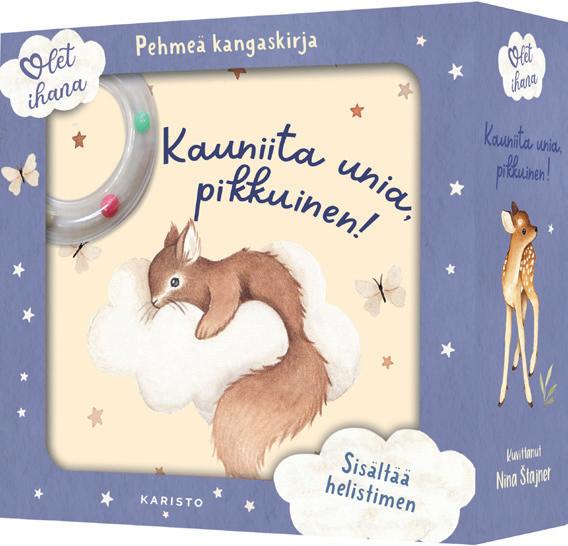 Suloinen kangaskirja, jossa mukana helistin! Vauva voi tunnustella pehmeitä sivuja ja katsella lempeitä kuvia pupuista, oravista ja muista metsän eläimistä. Kirja on pakattu lahjalaatikkoon. Kuvittanut Nina Štajner.