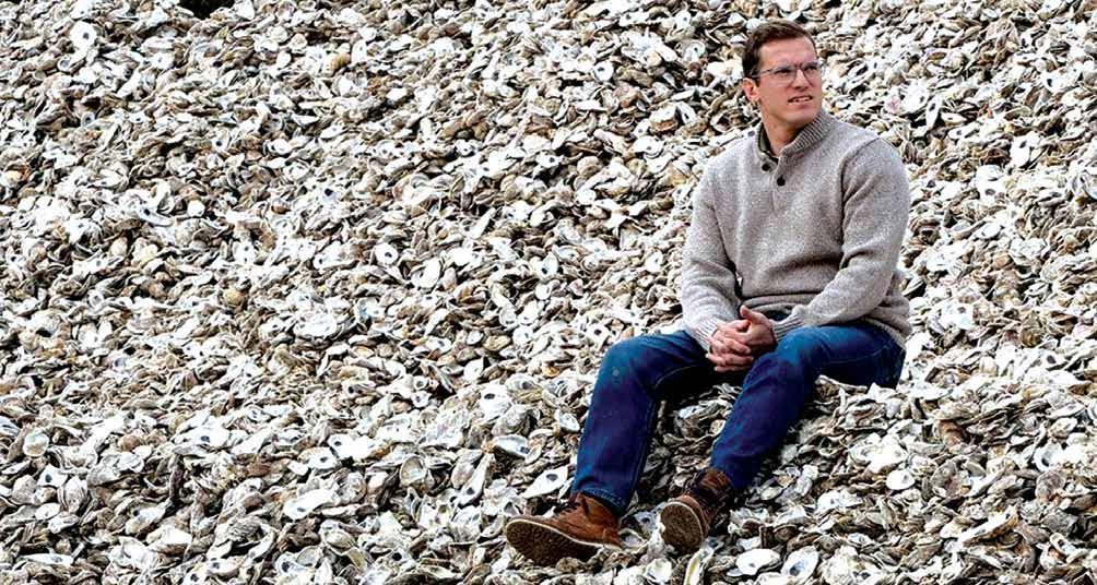 Matthew Gray, a scientist at the University of Maryland Center for Environmental Science, sits on a huge pile of oyster shells at the center’s Horn Point Laboratory. Photo by Dave Harp.
