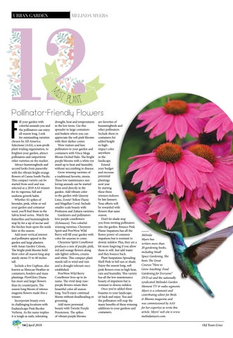 ill your garden with colorful annuals you and the pollinators can enjoy all season long. Look for outstanding varieties chosen by All-America Selections (AAS), a non-profit plant trialing organization, to brighten your garden, attract pollinators and outperform other varieties on the market. Attract hummingbirds and second looks from passersby with the vibrant bright orange flowers of Canna South Pacific. This compact variety can be started from seed and was selected as a 2018 AAS winner for its vigorous, full and uniform growth habit. Whether it’s spikes of lavender, pink, white or red your garden and container need, you’ll find them in the Salvia Jewel series. Watch the butterflies and hummingbirds stop by for a sip of nectar and the finches feast upon the seeds later in the season. Add more vertical interest and pollinator appeal in the garden and large planters with Asian Garden Celosia. The bright pink blooms hold their color all season long atop sturdy stems 31 to 40 inches tall. Include a few Cupheas, also known as Mexican Heather in containers, borders and mass plantings. FloriGlory Diana has more and larger flowers than its counterparts. The season long bloom of intense magenta flowers made this a winner. Incorporate beauty even in challenging locations with EnduraScape Pink Bicolor Verbena. As the name implies it is tough as nails, tolerating 14 | April 2019