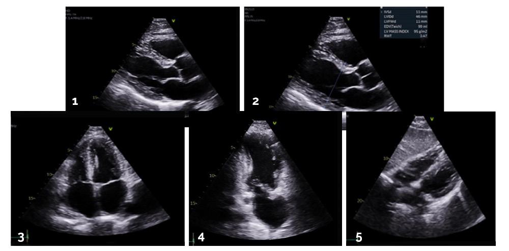 L’imagerie cardiaque est un défi pour plusieurs raisons. Une routine de base est établie pour ce type d’examen. Elle consiste en des vues parasternales, long et court axe, ainsi qu’en des vues apicales et souscostales (figure 1). L’anatomie et la fonction des valves et des ventricules sont étudiées. La fraction d’éjection, les gradients aortiques, mitraux, tricuspides et pulmonaires sont tous des aspects qui sont évalués et mesurés en cours d’examen. Les pathologies complexes observées seront imagées de façon encore plus détaillée dans le but de les définir davantage, souvent en utilisant des fonctions d’intelligence artificielle sur les appareils, par exemple, par imagerie du strain myocardique (figure 2).