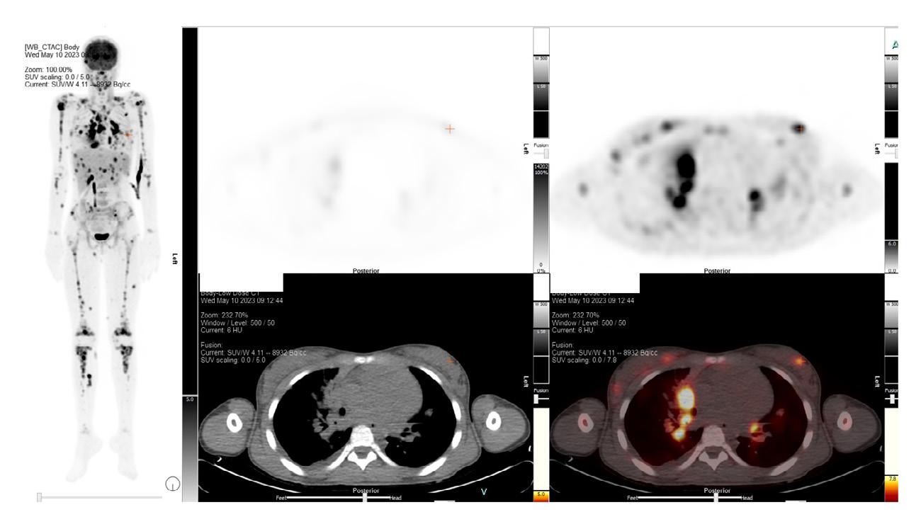 infiltrat pulmonaire très hypermétabolique avec un SUV max à 15,6. On trouve également plusieurs foyers hypercaptants osseux, dont un à la tête humérale droite avec un SUV max à 12,2, des foyers intramusculaires et même une suspicion d’atteinte du muscle orbitaire latéral droit. Il y a présence de foyers cutanés hypercaptants à la région fessière ainsi qu’aux cuisses, mais ces derniers sont plus discrets. Selon notre nucléiste, « Le tout laisse suspecter une atteinte néoplasique leucémique ou lymphomateuse sous-jacente ».