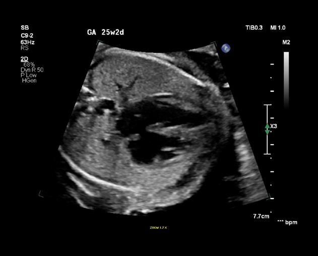 À l’instar des obstétriciens et des radiologistes lors de l’échographie morphologique, nous effectuons le dépistage des anomalies cardiaques de base selon les recommandations de l’ISUOG, soit : le situs et l’évaluation de l’axe du cœur, la coupe des quatre cavités cardiaques (figures 1 et 2 ), la vue des voies d’éjection gauche et droite, la vue des trois vaisseaux (artère pulmonaire principale, aorte ascendante et veine cave supérieure) et une vue de la latéralisation de l’aorte par rapport à la trachée. Ces vues permettent surtout de diagnostiquer des malformations cardiaques majeures, d’importantes dysfonctions myocardiques et de détecter la présence d’une arythmie. À partir du moment où une anomalie est suspectée, la patiente nous est envoyée afin de confirmer sa présence et d’en préciser la nature.