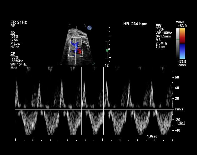 Parfois, le cœur est anatomiquement normal, mais c’est le rythme cardiaque qui attire notre attention. Le Doppler simultané de la veine cave supérieure et de l’aorte ascendante qui lui est adjacente (VCS-Ao) est, en quelque sorte, l’ECG fœtal. L’ECG demeure la panacée pour l’obtention des informations sur la conduction électrique cardiaque.
