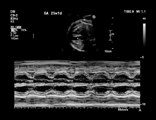 Lorsque des bradycardies, des tachycardies (figure 7 ) ou des blocs auriculoventriculaires fœtaux sont détectés, divers médicaments qui traverseront la barrière placentaire peuvent être administrés à la mère. Ils pourront parfois éliminer complètement ces arythmies et éviter la pose d’un pacemaker au nouveau-né. C’est à ce moment que la médecine fœtale entre en ligne de compte et que notre importance devient vraiment tangible.