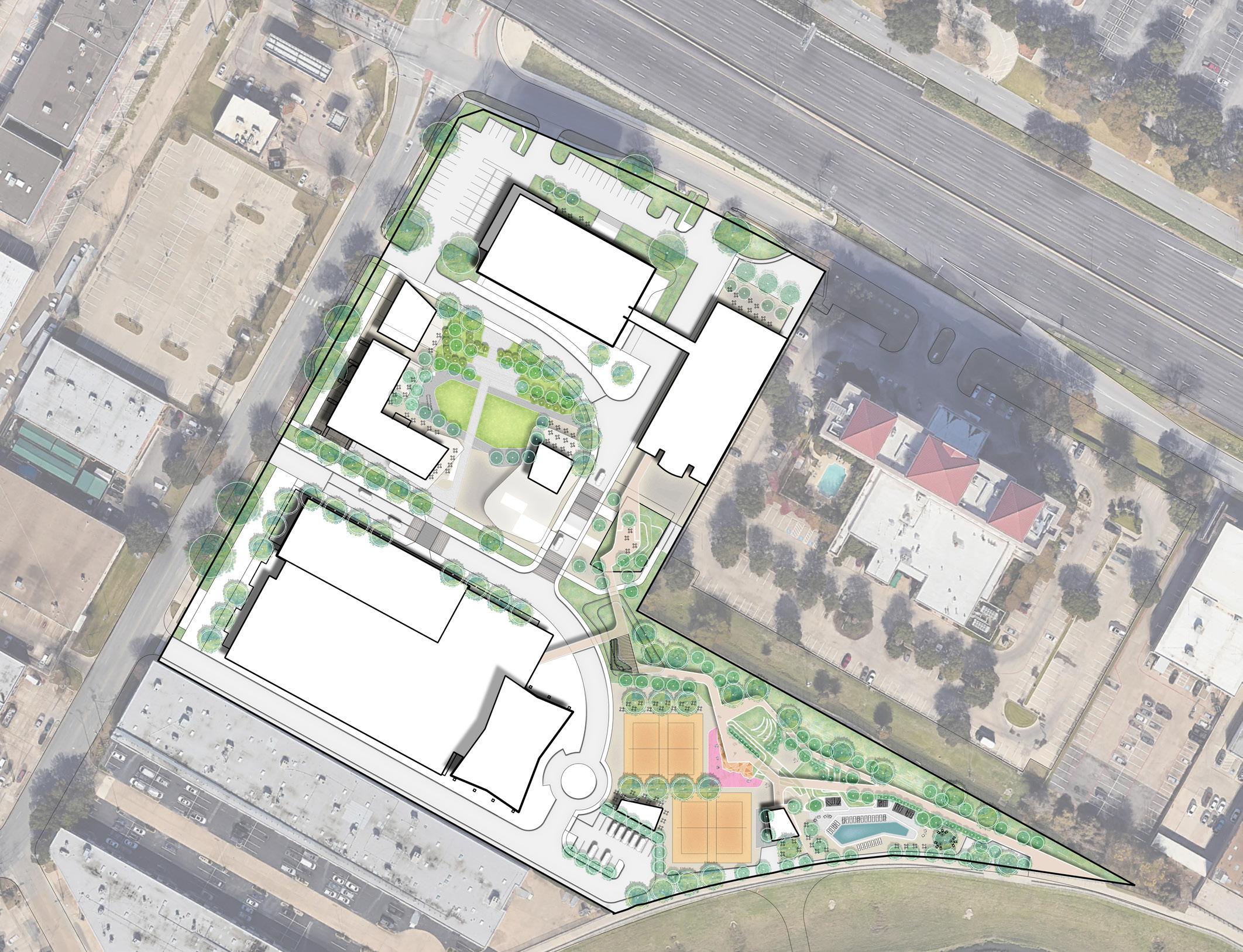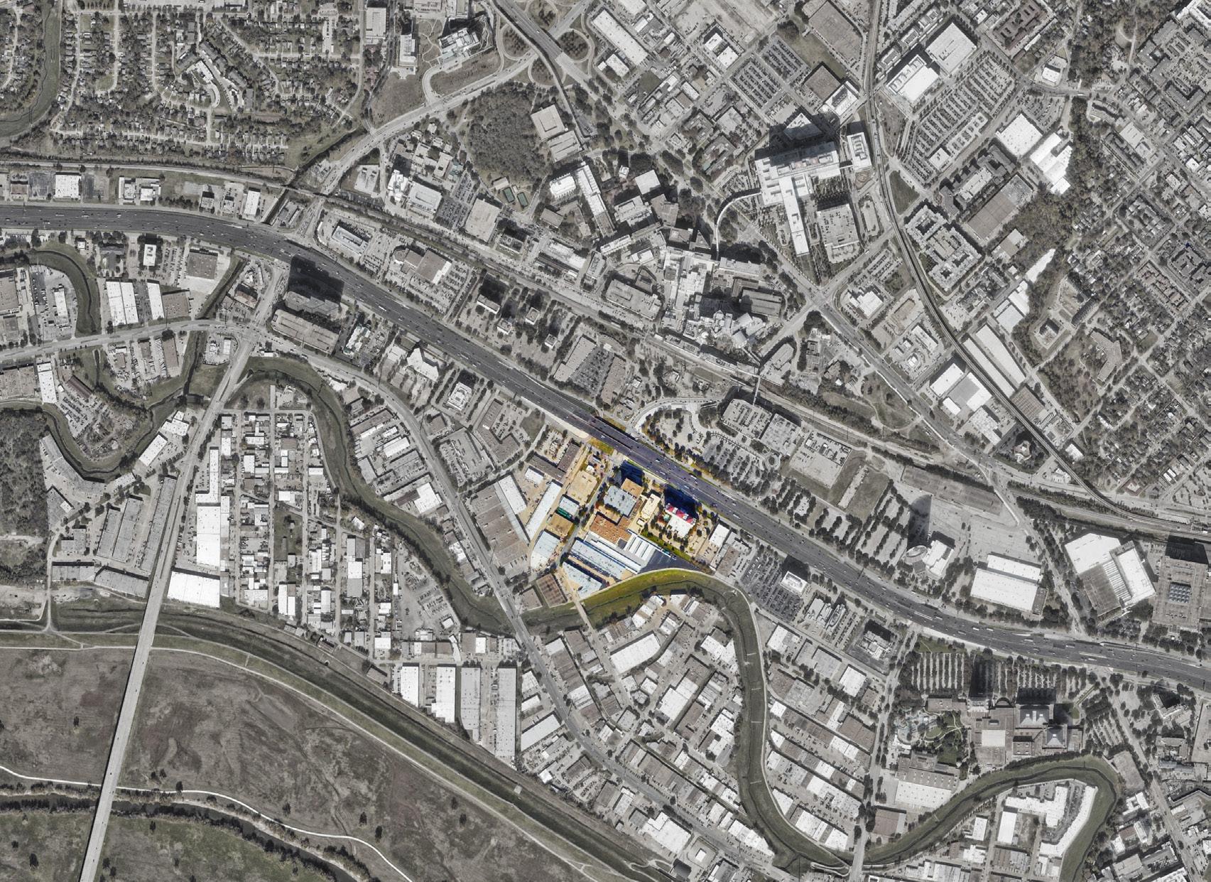 The site’s existing relationship to finished floor elevation and adjacent grade presents an opportunity to create elevated memorable connections between buildings directly to adjacent Trinity Strand Trail. that interact with nature.