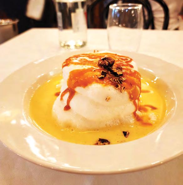 My dessert was a picture-perfect “Floating Island.” A substantial baked meringue was floating on a pool of vanilla Crème Anglaise. It was drizzled conservatively (and correctly) with caramel and topped with chopped pecans. I enjoyed the meal with a 2020 Georges Burrier PouillyFuissé.