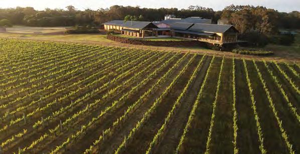 Beautiful vineyard rows and cottage in background during sunny day. Margaret river, Australia.