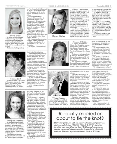 Rodney Alan Pilot of Fairhope. The bride-elect is the granddaughter of Mr. and Mrs. Ralph Morton Fleming of Nashville, Tenn., and Mr. and Mrs. Bill Steel Bowen of Franklin, Tenn. Miss Fleming is a graduate of Mountain Brook High School and the University of Alabama, where she was a member of Chi Omega sorority. She will be on staff with Campus Crusade in the fall. The prospective groom is the grandson of Mrs. E. Grace Pilot of Mobile and the late Mr. Walter Davis Pilot Sr. and Mr. and Mrs. Robert Patrick Downey Jr. of Mobile. Mr. Pilot is a graduate of Bayside Academy and the University of Alabama, where he was a member of Kappa Alpha Order. He will attend graduate school in the fall. A July wedding is planned in Fairhope. Sr. of Austin, Texas and Mr. and Mrs. Sam Preston Douglass Sr. and Ms. Marylyn Ballinger Douglass of Houston. Miss Douglass is a graduate of The Middlesex School in Concord, Mass. and of Vanderbilt University with a bachelor’s degree in human and organizational development and a minor in communication studies. She is a member of Kappa Kappa Gamma sorority and is employed by Kappa Kappa Gamma as a leadership consultant. The prospective groom is the grandson of Mr. Billy Alford Murdock of Enterprise and the late Mrs. Marguerita Huey Murdock and the late Mr. and Mrs. James Robert Gilchrist of Hartselle. Mr. Murdock is a graduate of Mountain Brook High School and a magna cum laude graduate and Phi Beta Kappa from Vanderbilt University with a bachelor’s degree in economics. He is employed by Regions Financial Corporation in Atlanta as an analyst for the business capital division. The wedding is planned for July 7 at Covenant Presbyterian Church in Nashville, Tenn.