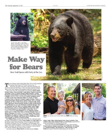 he new Barbara Ingalls Shook Black Bear Trail at the Birmingham Zoo opened with a special VIP Donor Party on Aug. 13. More than 200 guests were able to meet Bety and Sassy, the two North American black bears, in their new home inside the Alabama Wilds in the Junior League of Birmingham–Hugh Kaul Children’s Zoo. Seen at the event were: Birmingham City Councilor Valerie Abbott, Richard Adams, Susan Alexander, Leigh Allison, Stephen Armstrong, Ann Baker, Laura and Marcia Boykin, Mildred Boudra, Carolyn Brockman, Naomi Buklad, George Butler, Marcie Braswell, Catherine Cabaniss, Jefferson County Commissioner David Carrington, Karen and Phil Carroll, Tom Chelewski, Mollie Coe, Frank and Winn Crockard, Paul and Harriett Crockard, Angela Davidson, Wayne and Deborrah Davidson, Margie Davis, Monica Drake, Alex and Natalie Dudchock, Dr. Rex and Sara Harris, Brent and Robin Griffis, Hettie Hall, Leigh Haver, Maria Kennedy, Heather Locklar, Kristin Martin, Carol Maxwell, Lee and Laura McKinney, Stephanie Morgan, Tom and Elizabeth Neil, Nita Oliver, Dr. Dennis Pappas, Kellie Pappas, Martha Pezrow, Chris and Teresa Pfefferkorn, Erin Prince, Billy and LaVona Rushton, Dr. Jack Schaeffer, Leah Scalise, Shelby County Commissioner Rick Shepherd and wife Shannon, Darlene Smith, Kerry and Ellen Stein, Paul and Martha Stivender, Barry and Sherrie Thornton, Birmingham City Councilor Sheila Tyson, Karen Wadlington, Drs. Ryan and Susan Chu Walley, George and Francie Wheelock, Lynn Wilmoth, Judi Worm, Sam and Heidi Yates, Jean Anne Zauchin and David and Sandra Zauchin. Dr. William Foster, president and CEO of the Zoo, welcomed guests and made a presentation to trustees Nancy Hughes and Greg Logan from the Barbara Ingalls Shook Foundation. He also recognized The Daniel Foundation of Alabama, Hill Crest Foundation, the Birmingham Zoo’s junior board, Timken Foundation, O’Neal Industries, Dr. and Mrs. Dennis Pappas, Iberiabank, the Jefferson County Commission, DiscoverShelby. com, and the Schaeffer Eye Center for their support. Zoo board chairman Wally Nall III and board members Robert