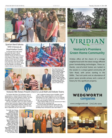 Vestavia Hills Rotary Present Check to Local Math and Debate Teams The Vestavia Hills Rotary Club presented a check to representatives of Vestavia Hills City Schools math and debate teams at a monthly meeting in October. The funds were raised through the eighth annual Iron City Chef competition which followed a barbecue theme this year. This year’s competition, held in July, paired a student of Jefferson State Community College’s culinary school with one of the four participating restaurants, Jefferson State Community College’s Bistro proVare, Shane’s Rib Shack, Moe’s Original BBQ and Jim N’ Nick’s BBQ. From left: Jerry Tracey, Alabama 13 chief meteorologist; Paul Edfeldt, rotary member; Chef Joseph Mitchell, Jefferson State’s Culinary and Hospitality Institute program director; Steve Hendricks; Steve Shelton, general manager of Rocky Ridge Western Market; and Russell Taylor, Western Supermarkets wine department assistant manager; Kent Howard, rotary member; with students Emma Henderson, Sherry Wu and Greta Chen.