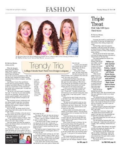 When the designers behind the North Shelbybased three07 women’s clothing line randomly took seats in their first fashion class at the University of Alabama in 2004, they said they never imagined the chance meeting would lead them to form a company—and deep friendships. April Moore, Courtni Tyre and Melissa Grimes were all pursuing bachelor’s degrees in apparel and textiles design at UA when they struck up a conversation in class and became fast friends with a common goal—to break into the fashion industry. “We just hit it off and formed a friendship,” Tyre said. “It was easy for us to work together from the very beginning. We did all of our (school) projects together, and it worked well because all brought different strengths to the table.” That friendship and easy collaboration led the college friends to open their own design business, three07, in 2010 after they had all graduated with bachelor’s degrees in apparel and textiles design. But to this day, the women marvel at how many things had to fall in place for them to realize their dream. Tyre, a native of Dothan, is the only one of the three women who set her sights on a career in the fashion industry at an early age. “I grew up always wanting to design,” Tyre said. “I was sketching all the time, but I didn’t learn to sew until I was in college.” And even though Tyre knew she wanted to work in the fashion industry, she entered UA as a psychology major. “Then I decided that I really wanted to follow my passion,” she said. “It was scary to make that phone call to my mother to tell her I was going to switch over to design, but I knew I