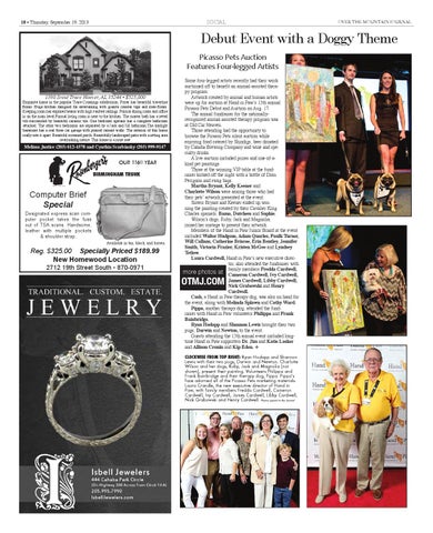 Some four-legged artists recently had their work auctioned off to benefit an animal-assisted therapy program. Artwork created by animal and human artists 1390 Scout Trace Hoover, AL 35244 • $525,000 Exquisite home in the popular Trace Crossings subdivision. Foyer has beautiful travertine were up for auction at Hand in Paw’s 13th annual floors. Huge kitchen designed for entertaining with granite counter tops and slate floors. Picasso Pets Debut and Auction on Aug. 17. Keeping room has exposed beams with high vaulted ceilings. Formal dining room and office The annual fundraiser for the nationallyis on the main level.Formal living room is next to the kitchen. The master bath has a jetted recognized animal-assisted therapy program was tub surrounded by beautiful ceramic tile. One bedroom upstairs has a complete bathroom at Old Car Heaven. attached. The other two bedrooms are separated by a Jack and Jill bathroom.The daylight basement has a real three car garage with poured cement walls. The exterior of this home Those attending had the opportunity to really sets it apart. Beautiful screened porch. Beautifully landscaped patio with a sitting area browse the Picasso Pets silent auction while overlooking nature. This house is a must see! enjoying food catered by Shindigs, beer donated Melissa Justice (205) 612-4578 and Cynthia Scarbinsky (205) 999-9147 by Cahaba Brewing Company and wine and specialty drinks. A live auction included prizes and one-of-aTH OUR 116 YEAR kind pet paintings. Those at the winning VIP table at the fundBIRMINGHAM TRUNK raiser kicked off the night with a bottle of Dom Perignon and swag bags. Martha Bryant, Kelly Keener and Charlotte Wilson were among those who had their pets’ artwork presented at the event. Sisters Bryant and Keener ended up winning the painting created by their Cavalier King To: Katherine Designated express scanPHONE: comCharles spaniels, Bama, Dutchess and Sophie. From: Over The Mountain Journal, 205-823-9646 FAX: 205-824-1246 Wilson’s dogs, Ruby, Jack and Magnolia, puter pocket takes the fuss Date: Sept 2013 joined her onstage to present their artwork. out of TSA scans. Handsome, leather multiple pockets This is with your AD PrOOF from the OvEr THE MOuNTAiN JOurNAl for theMembers of the Hand in Paw Junior Board at the event &Sept. shoulder strap. 19, 2013 issue. Please fax approval or changes to 824-1246. included Walter Hudgens, Adam Quarles, Paulk Turner, Will Callans, Catherine Briscoe, Erin Bentley, Jennifer Available in tan, black, and brown Smith, Victoria Frazier, Kristen McGee and Lyndsey makeSpecially sure all information is correct, Tetlow. Reg. Please $325.00 Priced $189.99 Laura Cardwell, Hand in Paw’s new executive direcincluding address Location and phone number! New Homewood tor, also attended the fundraiser with 2712 19th Street South • 870-0971 members Fredda Cardwell, more photos at family Please initial and fax back within 24 hours. Cameron Cardwell, Ivy Cardwell, if we have not heard from you by 5 pm of the Friday before the press date, James Cardwell, Libby Cardwell, your ad will run as is. We print the paper Monday. Nick Grabowski and Henry Cardwell. Thank you for your prompt attention. Cash, a Hand in Paw therapy dog, was also on hand for the event, along with Melinda Splawn and Cathy Ward. Pippa, another therapy dog, attended the fundraiser with Hand in Paw volunteers Philippa and Frank Ken Rosenberger Bainbridge. Over The Mountain Journal, 205-823-9646 ph., Ryan Hodapp and Shannon Lewis brought their two 205-824-1246, fax pugs, Darwin and Newton, to the event. August 2013 Guests attending the 13th annual event included longtime Hand in Paw supporters Dr. Jim and Katie Lasker This is your AD pROOF from the OveR The MOunTAin JOuRnAl for theand Allison Cronin and Kip Eden. ❖