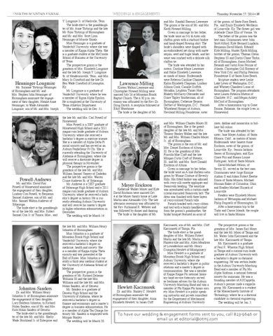 Y. Longmire Jr. of Nashville, Tenn. The bride-elect is the granddaughter of Ms. Anne Tortorigi and the late Mr. Ross Tortorigi of Birmingham and Mr. and Mrs. Scott Lyon Henninger of Muscle Shoals. Miss Henninger is a graduate of Vanderbilt University, where she was a member of Kappa Alpha Theta. She is a graduate student at the McCombs School of Business at the University of Texas. The prospective groom is the grandson of Mrs. Elizabeth Longmire and the late Mr. Joseph Y. Longmire Sr. of Hendersonville, Tenn., and Mrs. Mary Jo Crawford and the late Dr. Ben Wade Crawford of Lexington, Ky. Mr. Longmire is a graduate of Vanderbilt University, where he was a member of Sigma Alpha Epsilon. He is employed at the University of Texas Athletics Department. The wedding will be Dec. 31. the late Mr. and Mrs. Carl Powell of Homewood. Miss Powell is a 2007 graduate of Homewood High School and a 2011 magna cum laude graduate of Auburn University, where she received a bachelor’s degree in exercise science. She is a member of Alpha Delta Pi social sorority and has served as an Auburn Panhellenic Pi Chi. She is currently attending the University of Alabama at Birmingham, where she will receive a doctorate degree in physical therapy in November. The prospective groom is the grandson of the late Mr. and Mrs. William Samuel Yancey of Gadsden and the late Mr. and Mrs. Warren Cruise Andrews Sr. of Sylacauga. Mr. Andrews is a 2007 graduate of Sylacauga High School and a 2011 magna cum laude graduate of Auburn University, where he received a bachelor’s degree in history. He is currently attending Auburn University and will receive his master’s degree in higher education administration in December. The wedding will be March 14. the late Mr. and Mrs. William Henry Johnston of Birmingham. Miss Johnston is a graduate of Mountain Brook High School and Vanderbilt University, where she received a bachelor’s degree in medicine, health and society. She is a member of Kappa Alpha Theta sorority and was presented at the Ball of Roses. Miss Johnston is currently a third-year medical student at the University of Alabama School of Medicine. The prospective groom is the grandson of Mr. Richard Delamar Williams III and the late Mrs. Williams and the late Mr. and Mrs. Nolan Sanders, all of Decatur. Mr. Sanders is a graduate of Decatur High School and the University of Alabama, where he received a bachelor’s degree in finance and economics and a master’s degree in business administration. He is a member of Alpha Tau Omega fraternity. Mr. Sanders is employed with Morgan Stanley. The wedding will be March 28.
