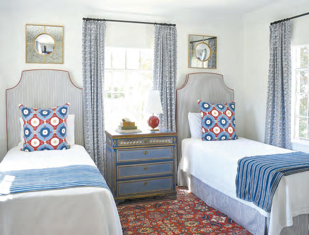corresponding blue paint. Upstairs, carpet was pulled up in a back bedroom to reveal original hardwoods then covered with a red patterned rug that Tumpy had paired with a blue chest found at Betty Margaret’s The Nest in Homewood. Coordinating textiles were the selected for the two twin beds.
