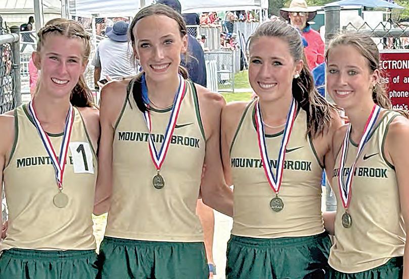 Above, the Spartans’ 4x800-meter relay team, from left, Ashby Russell, Callie Kent, Kennedy Hamilton and Georgia Jane Stuckey. Russell, below, helped the Spartans capture the AHSAA Class 6A girls outdoor track and field state championship May 2-4 in Gulf Shores and then helped the Mountain Brook girls win the state lacrosse championship on May 4.