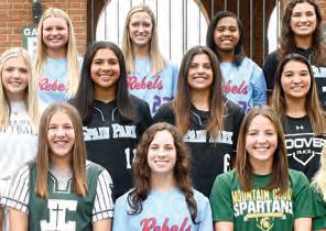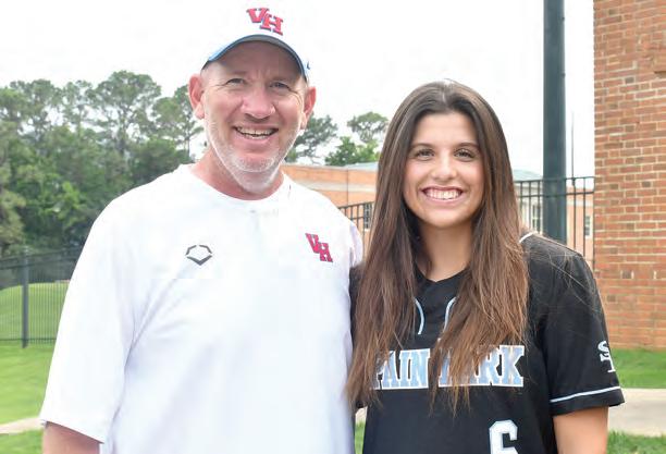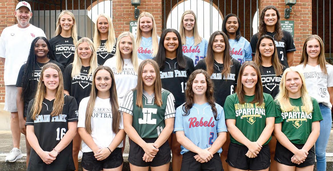 MEMBERS OF THE 2023 ALL-OVER THE MOUNTAIN SOFTBALL TEAM are, front row from left, Charlee Bennett, Spain Park; Emma Hawkins, Oak Mountain; Mallory Ogle, John Carroll Catholic; Ella Gallaspy, Vestavia Hills; Ellie Pitts, Mountain Brook; and Claire Robinett, Mountain Brook. Middle: Kaitlyn Raines, Hoover; Carolyne Hecklinski, Hoover; Anna DuBose, Oak Mountain; Maggie Daniel, Spain Park; Katie Flannery, Spain Park; Bella Foran, Hoover; and Madison Letson, Homewood. Back: Coach of the Year — John Simmons, Vestavia Hills; Hannah Christian, Hoover; Emily Sims, Hoover; Maia Simmons, Vestavia Hills; Tait Davidson, Vestavia Hills; Kayla Franklin, Vestavia Hills; and Ella Reed, Spain Park. Not pictured: Alea Rye, Oak Mountain.