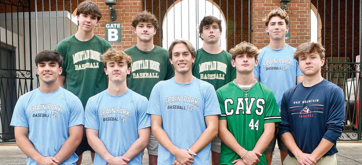 MEMBERS OF THE 2023 ALL-OVER THE MOUNTAIN BASEBALL TEAM are, above, front row from left, Evan Smallwood, Spain Park; Matthew Widra, Spain Park; CJ Gross, Spain Park; Jackson Miller, John Carroll Catholic; and Nick McCord, Oak Mountain. Back: Caleb Barnett, Mountain Brook; James Graphos, Mountain Brook; Charlie Berryman, Mountain Brook; and Jacob Tobias, Spain Park. Below, from left, from Vestavia, Grant Downey, Hudson Walburn, Aiden Black, Coach of the Year, Jamie Harris, Jackson Harris, Jable Ramey, Christopher Johnston, and John Paul Head. Not pictured: Cole Edwards, Evan Smallwood, Clay Spencer, Lucas Thornton, Spain Park; RJ Hamilton, Hoover; Levi Nikoli, Tripp Gann, Homewood; John Robicheaux, Gabe Young, Mountain Brook; Brady Waugh, Drake Meeks, Briarwood.