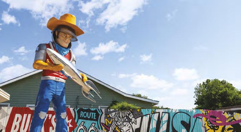 Buck Atom’s Cosmic Curios On 66 Stop to meet the space cowboy who’s become one of Tulsa’s favorite denizens since he arrived in 2019. The 21-foot-tall, rocket-ship toting-Buck Atom stands outside a 1950s-era PEMCO gas station that’s been transformed into a Route 66 souvenir store.