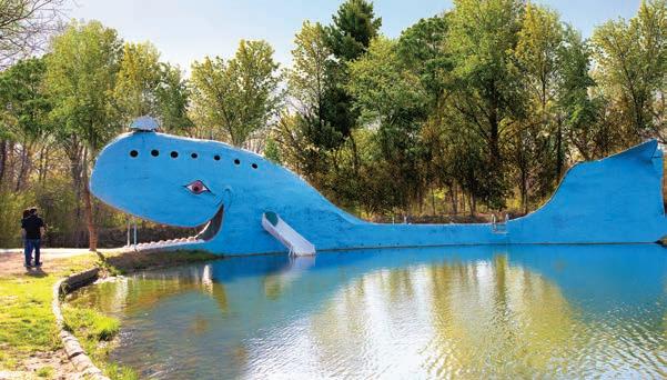 Stop for a selfie with the largest piece of Route 66 kitsch art in Oklahoma. This 80-foot-long smiling whale has welcomed travelers since the early 1970s. Today, you’ll find nature trails, a catch-andrelease fishing pond, picnic areas, and a gift shop.