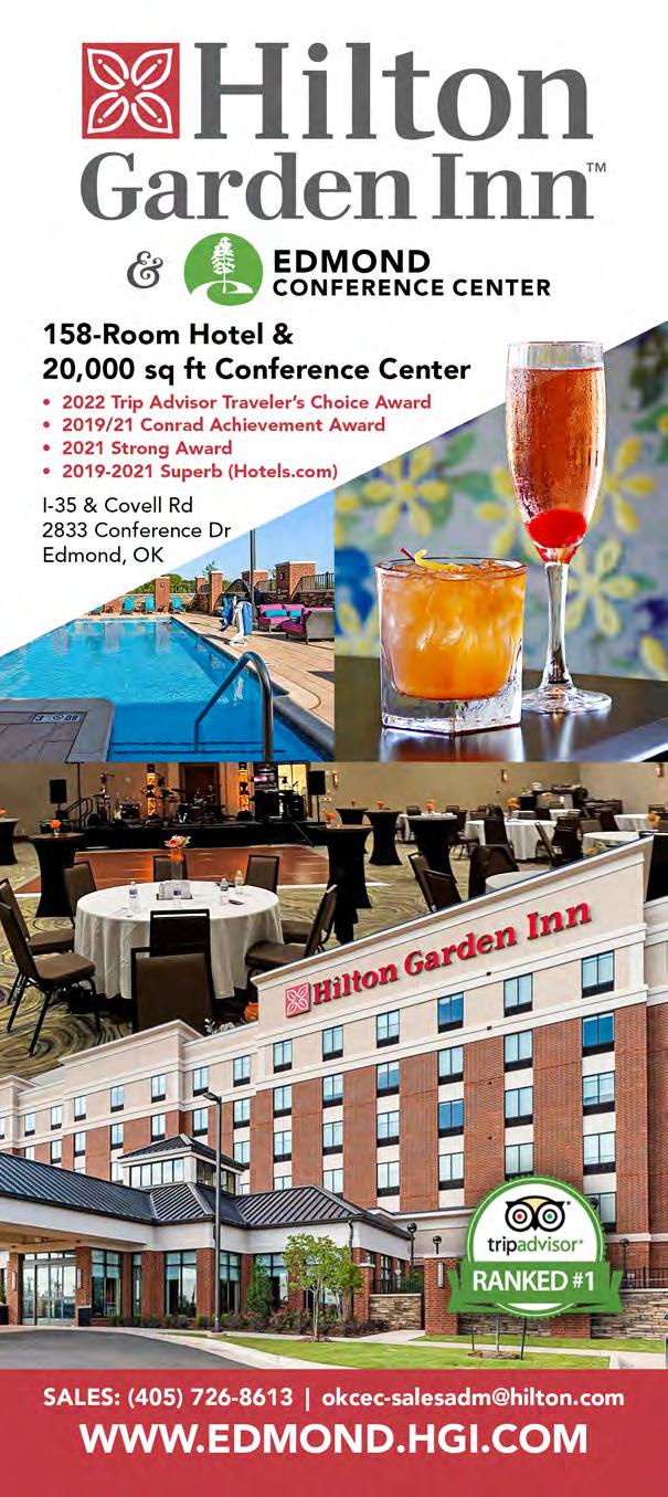 MEET IN EDMOND UP TO 1,000 Aspen Ranch 1000 Winners Circle Hilton Garden Inn & Edmond Conf. Center 2833 Conference Dr Oklahoma Christian University 2501 E Memorial Rd UCO Nigh Center 100 N University Dr FOR 100-500 Boulevard Steakhouse 505 S Boulevard Clauren Ridge Vineyard & Winery 6000 W Waterloo Rd Edmond Fine Arts Institute 27 E Edwards Edmond History Museum 431 S Boulevard Golf Club of Edmond 4001 Fairfax Dr KickingBird Golf Special Events Center 1600 E Danforth Rd Oak Tree Country Club 700 W Country Club Dr Petroleum Club North 1 N Sooner Rd St. Luke's United Methodist Church 900 N Sooner Rd The Barn at the Woods 4375 NW 178th St UCO Jazz Lab 100 E 5th St UCO Y Chapel of Song 100 N University Dr Venue 102 94 W 1st St Yay on Broadway 501 N Broadway UP TO 99 Café Evoke 103 S Broadway Cafe Icon Sushi & Grill 311 S Blackwelder Charleston's Restaurant 3409 S Broadway Fairfield Inn & Suites by Marriott 301 Meline Dr Hampton Inn by Hilton 300 Meline Dr Holiday Inn Express & Suites 3840 E 2nd St Inspirations Tea Room 2118 W Edmond Rd Interurban Restaurant 1301 E Danforth Rd Pepperoni Grill 1000 W Covell Rd Red Door Event Suite 1401 & 1407 S Fretz Dr Rodkey House 410 S Littler Sleep Inn & Suites 3608 S Broadway The Stables at Icehouse 119 W 2nd St UCO Boathouse at Arcadia Lake Edmond Park Conference? Meeting? Gathering? Plan it here! 2023 EDMOND DESTINATION GUIDE 68
