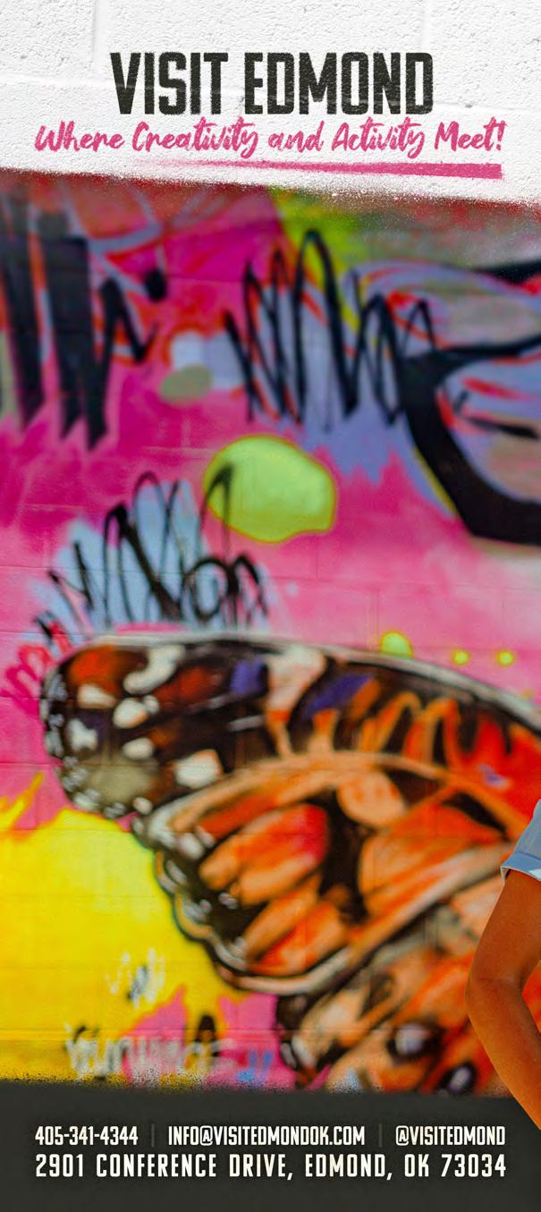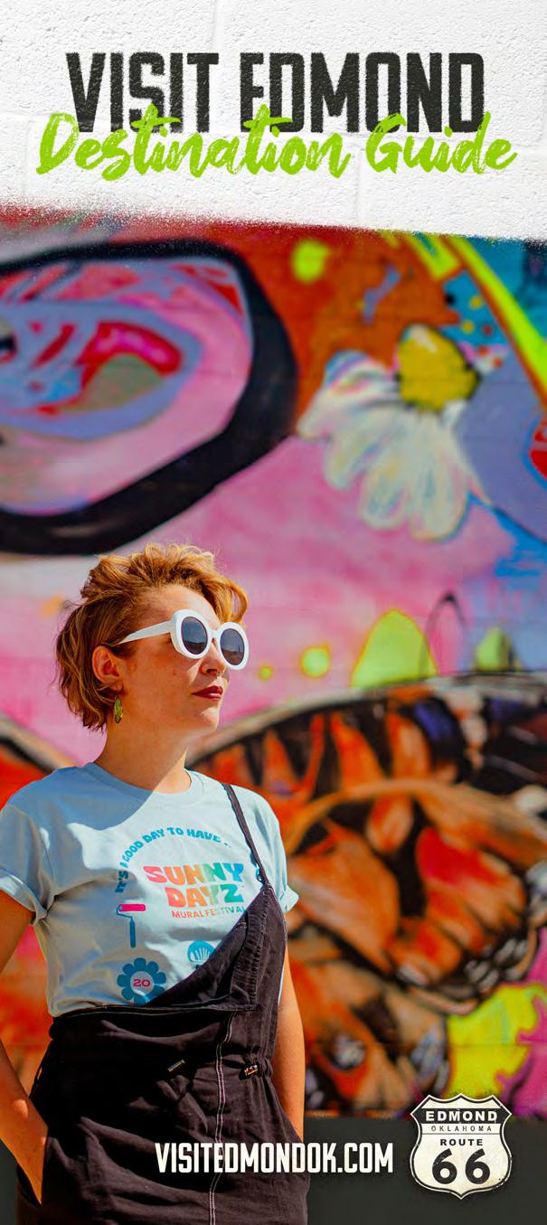 Edmond. The Festival exists to empower, elevate and celebrate female and nonbinary artists and muralists through the creation and advocacy of public art. sunnydayzmuralfest.com @sunnydayzmuralfest Cover Mural Artist: Ashlyn Faulkner @ashlyn_faulkner Cover Photographer: Hoku Tenneke @hokulanilea Photos Throughout: Eriech Tapia Contributing Writer: Maggie Murdock Nichols @maggiemurdy All Laughs by Jake Beeson 2 2023 EDMOND DESTINATION GUIDE