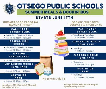 Otsego is thrilled to be able to offer FREE breakfast and lunch to kids at five locations this summer! The Bulldogs Bookin’ Bus is also back on the road two days a week! In addition, the City of Otsego will host Tuesday night Family Fun Nights at the TOP Pavilion with dinner at 5:30pm (free for kids, $5 for adults) and our Food Service Department is putting on Wednesday afternoon events at Northside Park after lunch at 1pm. Don’t miss out!!
