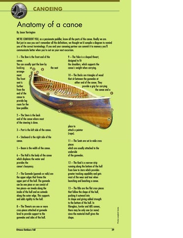 Anatomy of a canoe By Jason Yarrington WE’RE CONFIDENT YOU, as a passionate paddler, know all the parts of the canoe. Really we are. But just in case you can’t remember all the definitions, we thought we’d compile a diagram to remind you of the correct terminology. If you and your canoeing partner can commit it to memory you’ll communicate better when you’re out on your next excursion. 1 – The Bow is the front end of the canoe. You can usually spot the bow by looking at 2 the seat 3 arrange10 ment. 4 The front seat is 8 further 9 from the 16 end of the 7 canoe to provide leg room for the bow paddler.