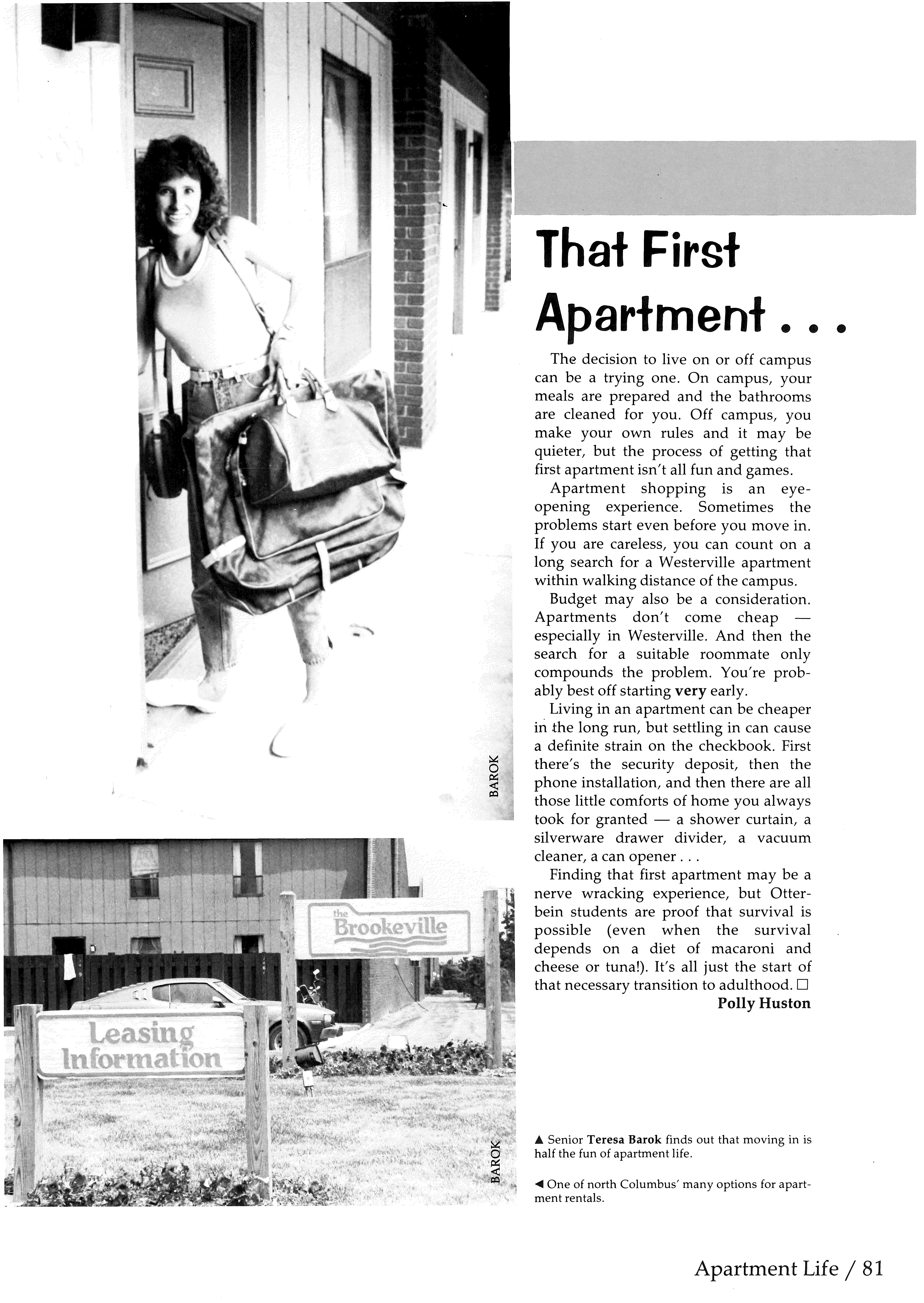 Finding that first apartment may be a nerve wracking experience, but Otterbein students are proof that survival is possible (even when the survival depends on a diet of macaroni and cheese or tuna!). It's all just the start of that necessary transition to adulthood.