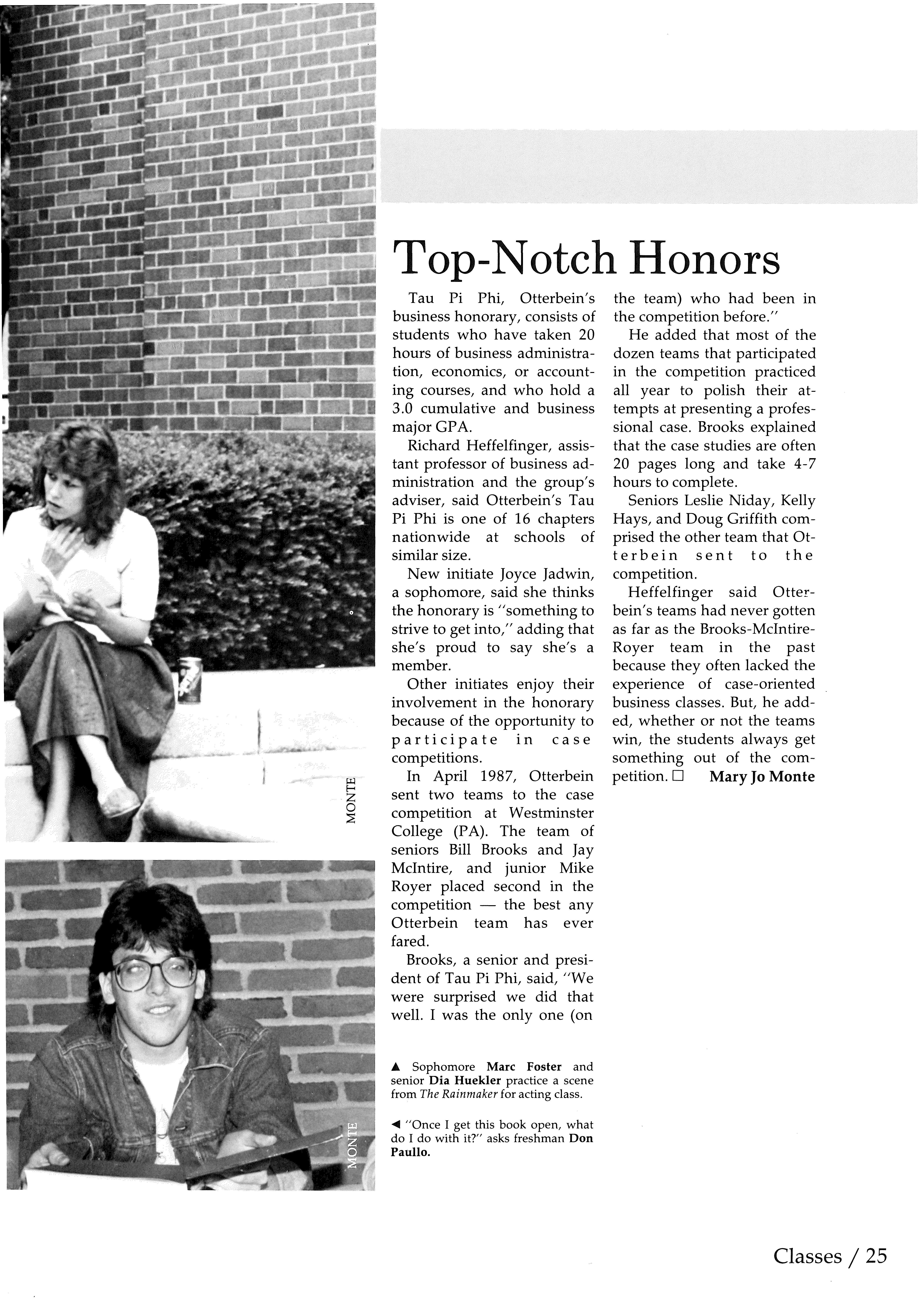 In April 1987, Otterbein sent two teams to the case competition at Westminster College (PA). The team of seniors Bill Brooks and Jay McIntire, and junior Mike Royer placed second in the competition - the best any Otterbein team has ever fared.